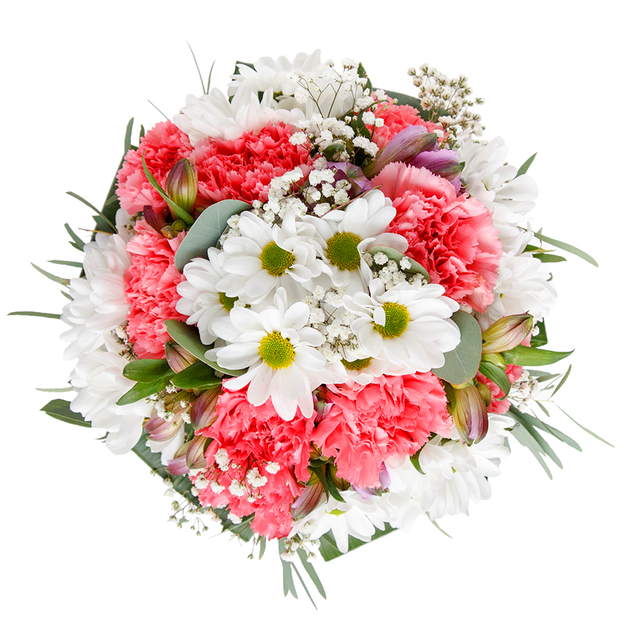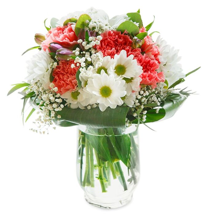 Surprise someone special with our luxurious and unique floral ensemble. This arrangement combines snow-white chrysanthemums, delicate gypsophila, and light pink carnations, all artistically arranged with aspidistra leaves. We ensure each flower is hand-selected for unparalleled freshness and quality.